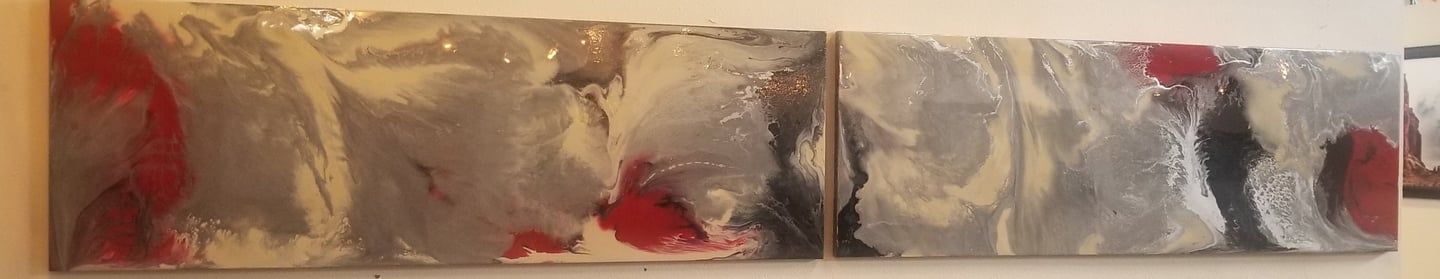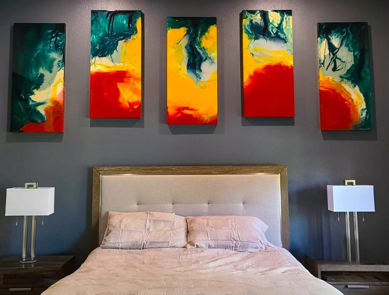 SOLD - Rhapsody is a fiery 8-foot by 4-foot diptych consisting of two 4-foot by 4-foot panels. This commissioned piece embodies the essence of a phoenix rising from the ashes, symbolizing rebirth and transformation. Crafted with a vibrant palette of reds, oranges, and yellows, the artwork captures the dynamic energy associated with the mythical bird. A talented Las Vegas designer commissions this stunning piece, which adds a bold statement to any space.