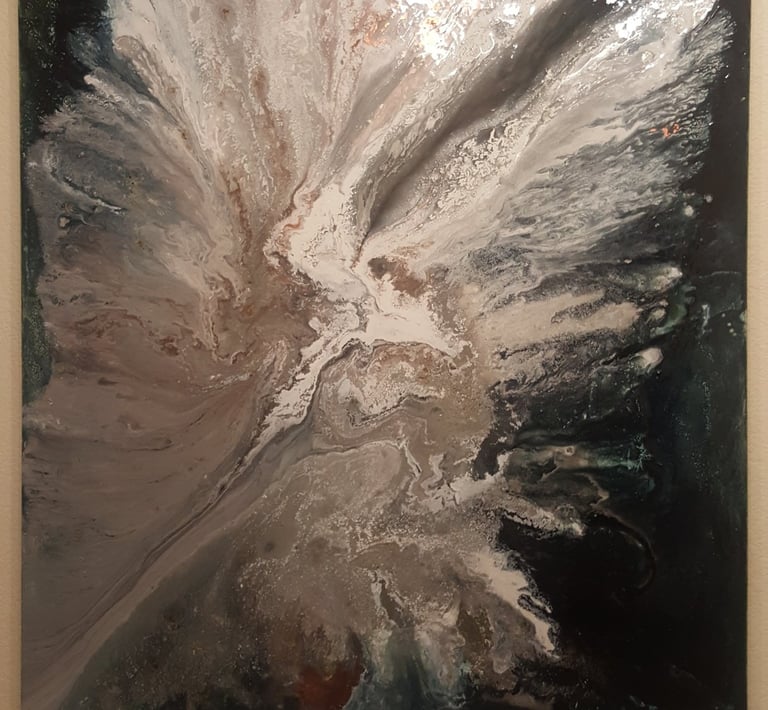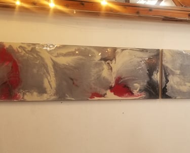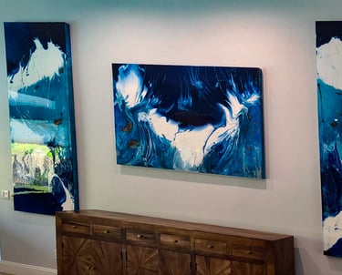 SOLD: Trilogy is an original mixed-media triptych created in 2020. Measuring 4 feet by 11 feet, this artwork utilizes resin, metallic powders, oils, and acrylics to produce a multi-dimensional visual experience. The piece invites viewers to explore the intricate interplay of colors and textures, revealing new details with each observation.