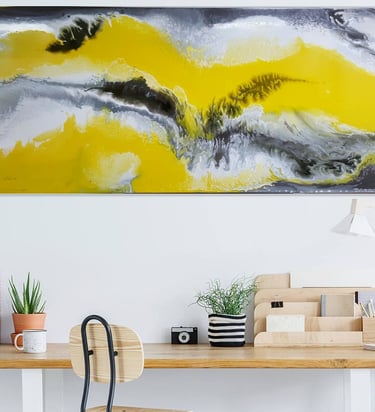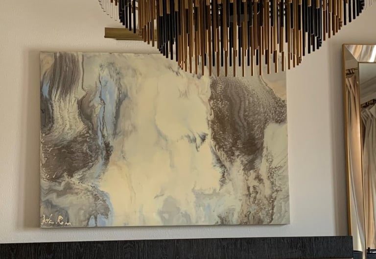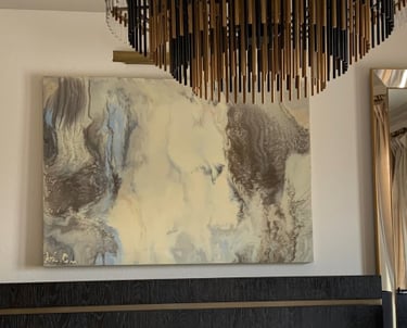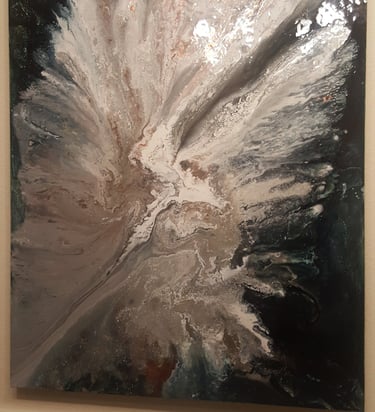 Painted with acrylics, metallic powders, and resin, it presents a multi-dimensional composition that reveals new details upon each viewing. Tsunami captures the dynamic energy and fluidity reminiscent of ocean waves.