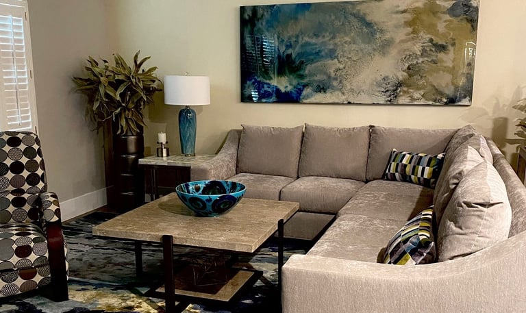SOLD: Serene Triptych is an original mixed-media artwork by Joline Renn, created on May 3, 2020. This expansive piece measures 4 feet by 11 feet and is composed of three panels. Crafted with a harmonious blend of resin, metallic powders, oils, and acrylics, the triptych offers a multi-dimensional visual experience.