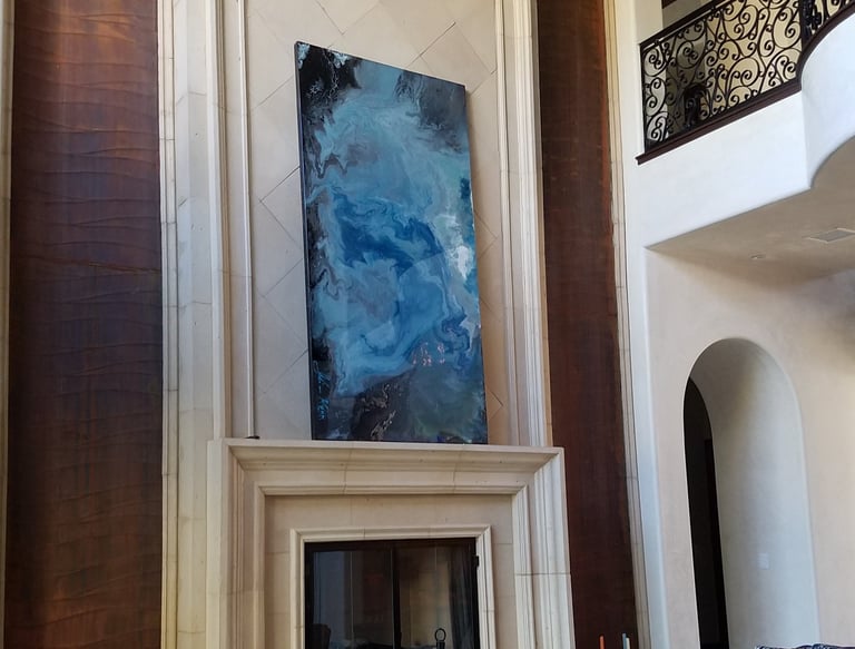Infinite Waters is an original mixed-media painting created on October 28, 2016. Measuring 8 feet by 4 feet, it incorporates resin, enamel, metallic powders, and oils, resulting in a multi-dimensional composition that reveals new details upon each viewing.